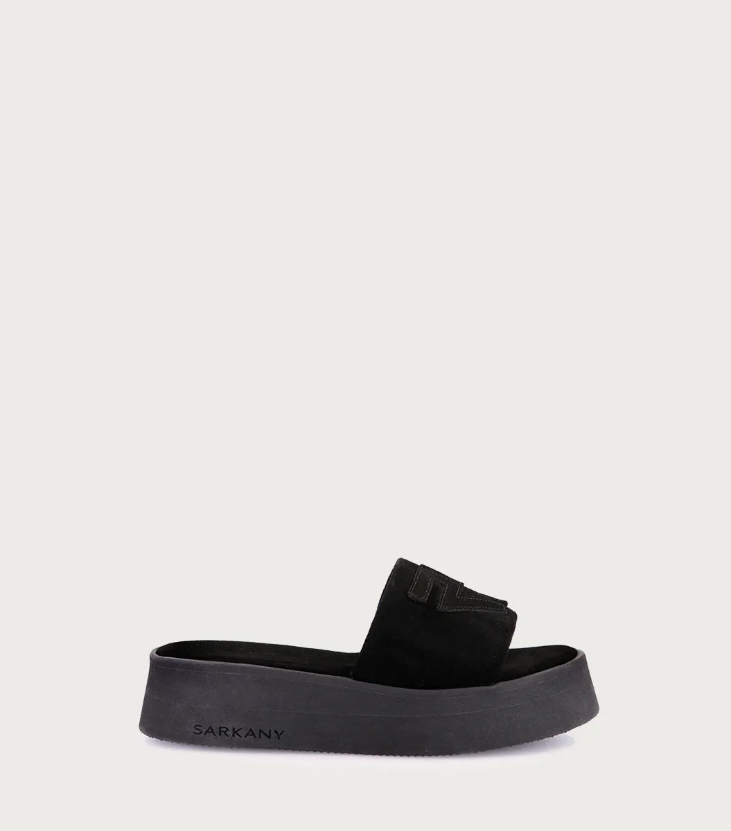 Plataforma Viper negro. De faja de gamuzòn con logo en mismo material. Forrería de cuero vacuno. Sobre plataforma de goma EVA de 4 cm. Perfecta para un look sofisticado. Cuidados:No mojar. No lavar. Evitar fuertes roces ya que se puede desgastar material, apliques y color original.
