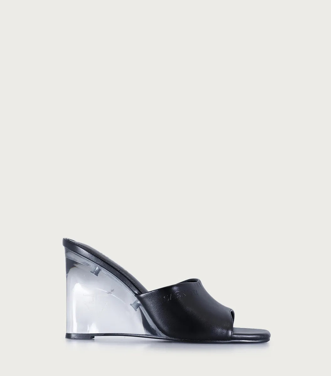 Sandalia Narda negro en fibras animal friendly, con logo y forrería en fibras animal friendly. Taco acrílico con logo grabado a láser y suelín de goma para máxima estabilidad. Altura del taco: 9 cm. Perfecto para quienes buscan un calzado cómodoy moderno Cuidados:No mojar, no lavar, evitar fuertes roces ya que se puede desgastar material y original o dañar los apliques.
